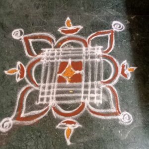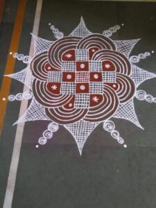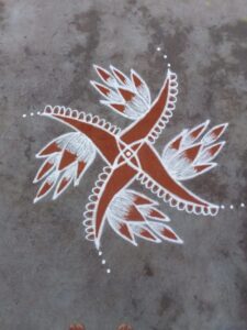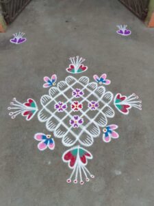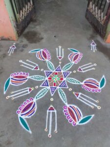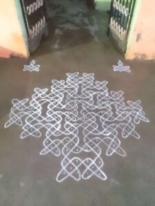 Embarking on this project can improve our problem-solving skills. As we draw a grid with dots and try to connect them to a design of our own, we end up connecting and ensuring that all points are enclosed by a drawing-line, thus sorting out the mess in our mind too. Most of these captivating patterns are first tried with paper and pencil or on floors in the free time before they are tried outside on the threshold. There are frequent contests so that the young learn the traditional style from the older lot. Often enough, there is a healthy competition going on among fellow Kolam- lovers and more intricate the designs, the more pleasure is derived.